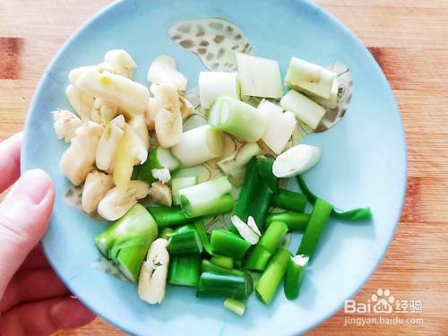 蒜拍扁葱切段,葱白,葱绿分开。