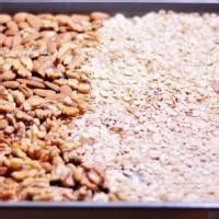 2.将核桃、杏仁和燕麦片均匀的铺在烤盘上,入预热好的烤箱焙烤10分钟