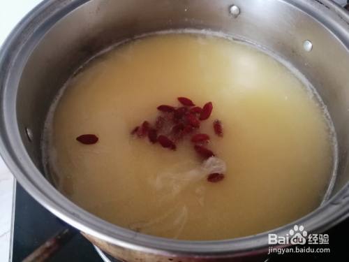 放入玉米糊,玉米粒,用勺子沿着锅边滑动,以免糊锅,大火烧开,中小火煮10分钟左右,粥变的粘稠,放入枸杞煮半分钟。