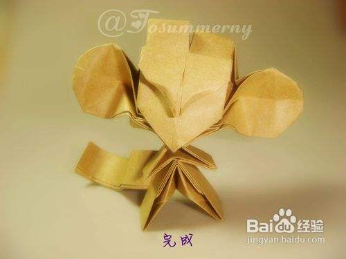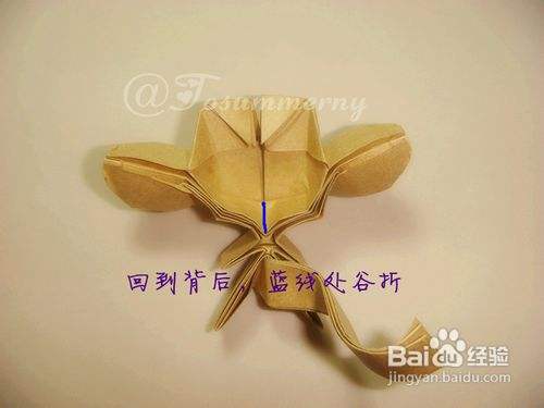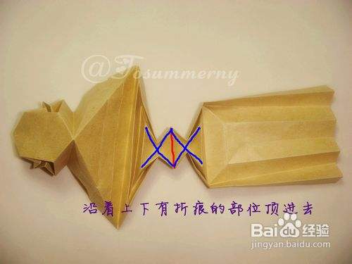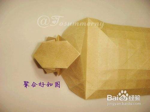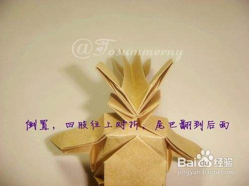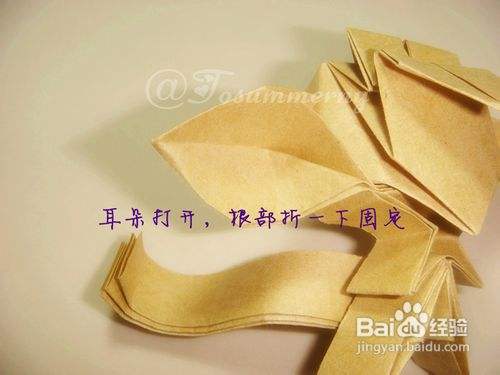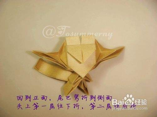 回到正面,把尾巴弯折到侧面,头上第一层往下折,第二层往后折