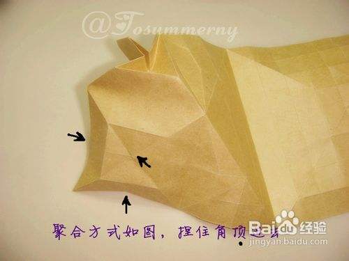 开始整理头部,参考已有折痕,找到图中的黑点向下顶,沿山谷线收拢
