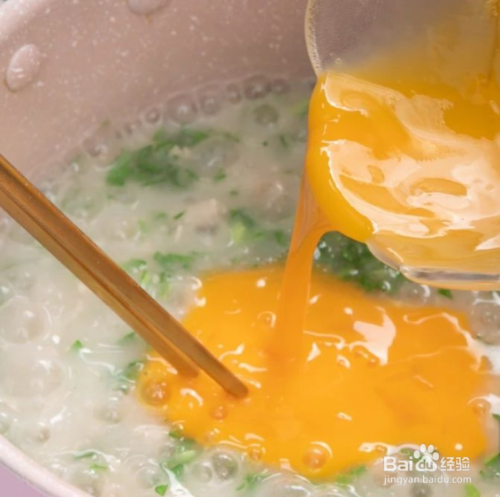 再加入青菜叶末和鸡蛋液,不停搅拌均匀,煮熟。
