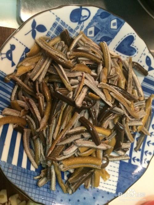 买活的黄鳝请店家当场去骨划丝,回来洗净后再加工一下,切短,切细,用黄酒腌制半小时。