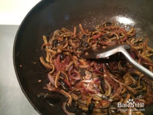 洋葱炒熟后,拨到锅周围,当中空出,加鳝丝,注意保持大火
