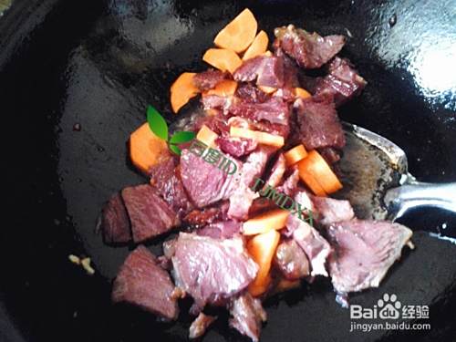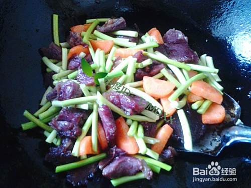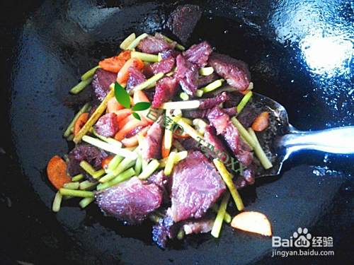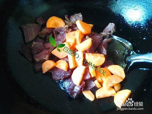 上炒菜锅加入适量的调和油烧至6成熟,放入切好的牛肉和胡萝卜翻炒片刻。