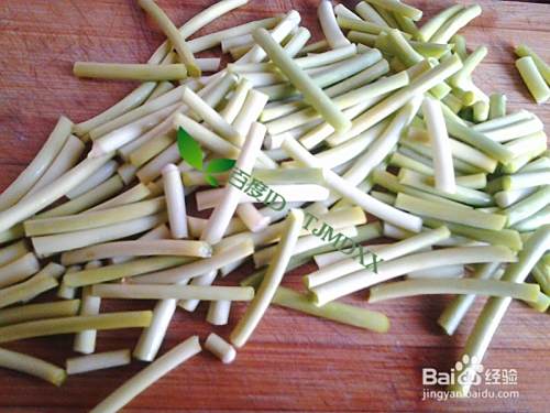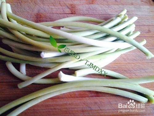 洗净的蒜苔切成如下图片中所示的长度备用。