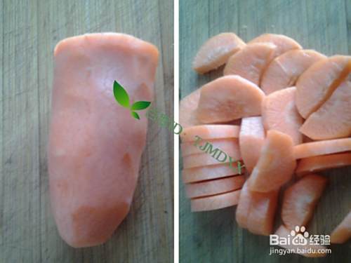 取一根胡萝卜削去皮,洗净,用菜刀切成如下图片中的半圆片形状,薄厚要适中。