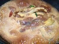 锅里放少许油,加入冰糖,中小火炒到冰糖溶化,然后再加一勺白糖(这里糖的分量可以根据自己习惯的甜度适当增减)。调小火,炒到糖稀呈现焦糖色,或者叫琥珀色。这时候没有糖泡也没关系。放五花肉,均匀的让每一面都裹上焦糖,鸭胗和鸡爪也依次放入,这时候应该就会有大量的糖泡涌现了。