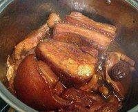 转小火,慢慢煮,大概半小时到40分钟,汤汁应该就会变得很少了,这时候关火,趁热把五花肉和鸡爪调换位置,让在上层的鸡爪到下层接受汤汁的浸泡。在晾凉凝固之前,取出所有卤味,留下卤汁,收好。就算大功告成了。