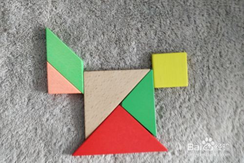 在正方形上面,放上黄色三角形挨着,右端一齐,如图。这样就拼好了。