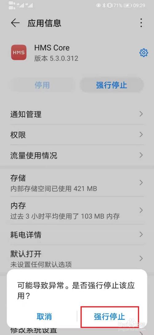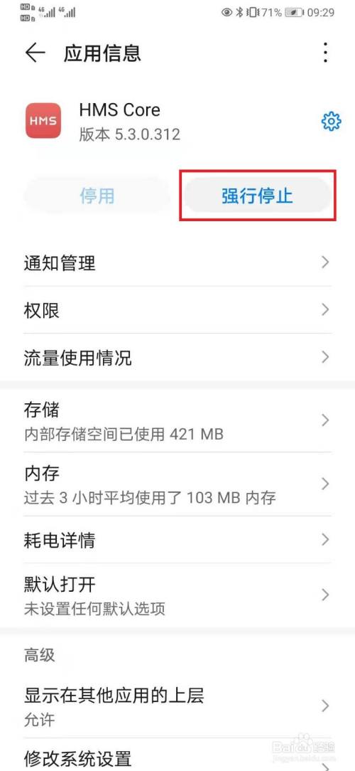 进入HMS服务应用信息页面,点击【强行停止】操作。