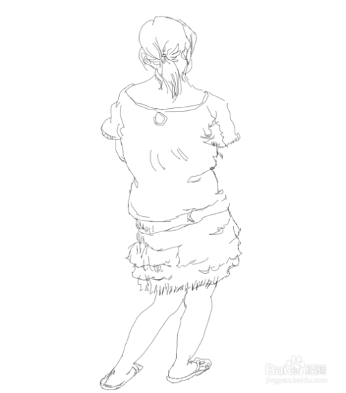 最后再在脚部上画出女孩的脚上穿的凉拖鞋,这样我们的女孩背影就画好了,如图所示: