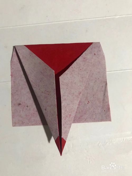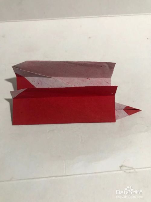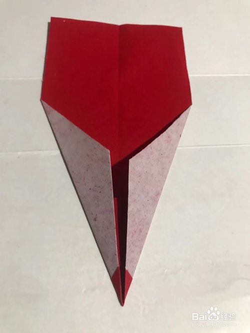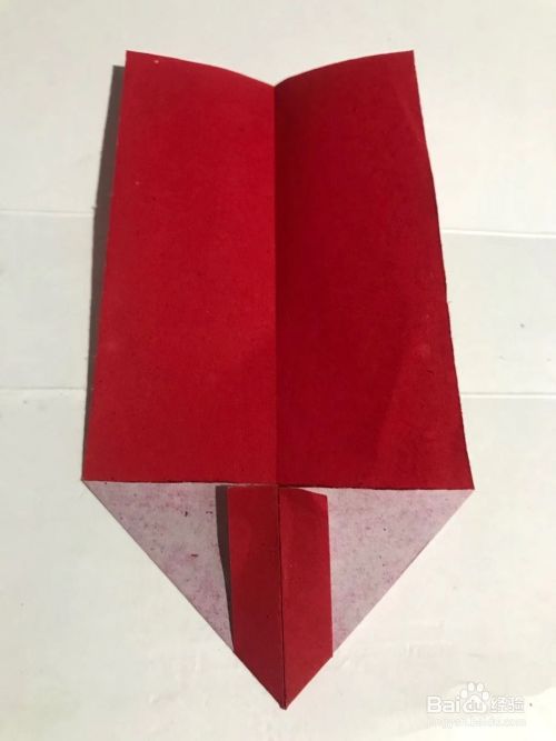 第四步 对折好之后 把它竖起来 有1厘米左右格的那头放在下面 然后左右两角都向上对齐中线折 折出一个尖角