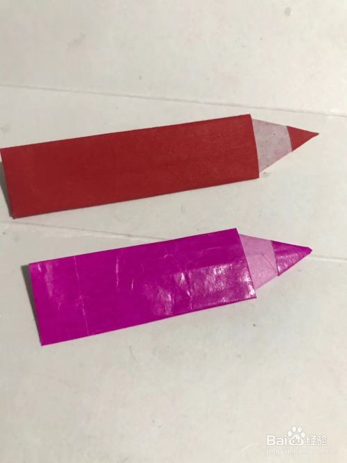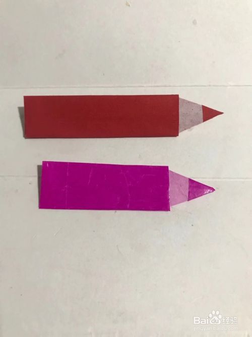 幼儿园手工启蒙折纸 两支漂亮的彩色铅笔 怎样用彩纸折叠 取正方形彩纸 用手工小刀一分为二 竖起来摆放 再把它正面朝下 然后从下向上折叠出铅笔芯 再继续向上折叠 两边连续两次向中间折出削过的部分 再从上面向背面翻折 在削铅笔的交叉点处 包折上作为铅笔杆即可