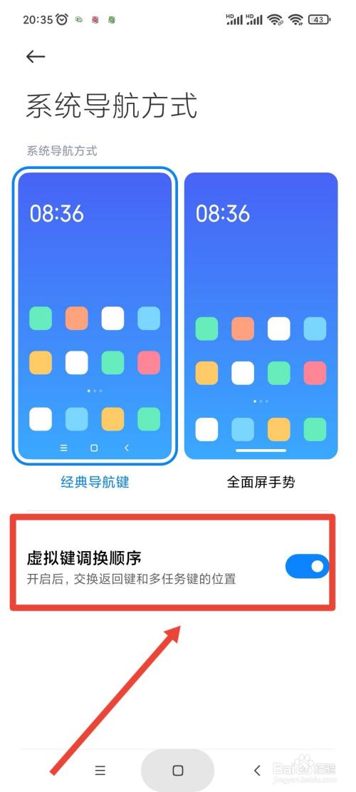 在系统导航方式界面,开启虚拟键调换顺序,返回键可以更换位置。