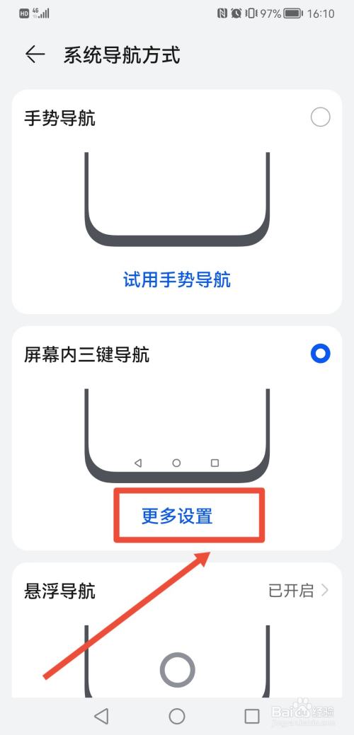 进入系统导航方式界面,屏幕内三键导航,点击更多设置。