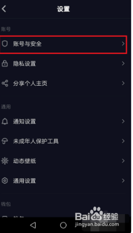 此时打开“设置”的界面,点击“账户与安全”选项。