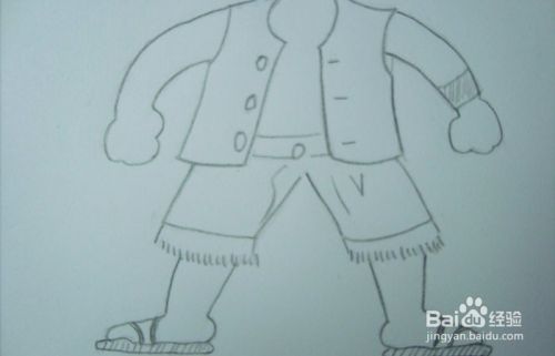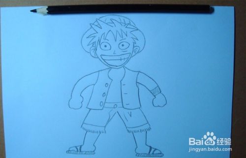 然后,用铅笔细致刻画路飞的身体和服饰部分,注意人物服饰衣服上有三颗扣子也要画出,裤子上的绒线 ,细节要准确,如下图所示。