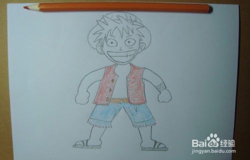 用红色彩铅笔给路飞的衣服涂上颜色。