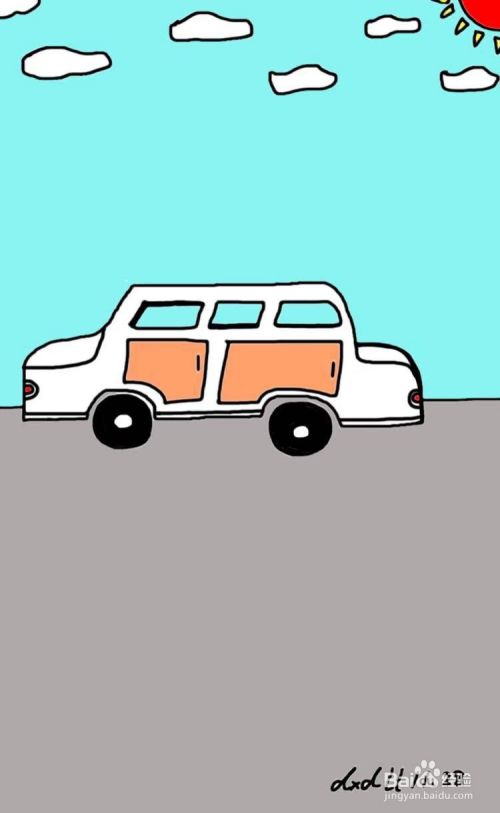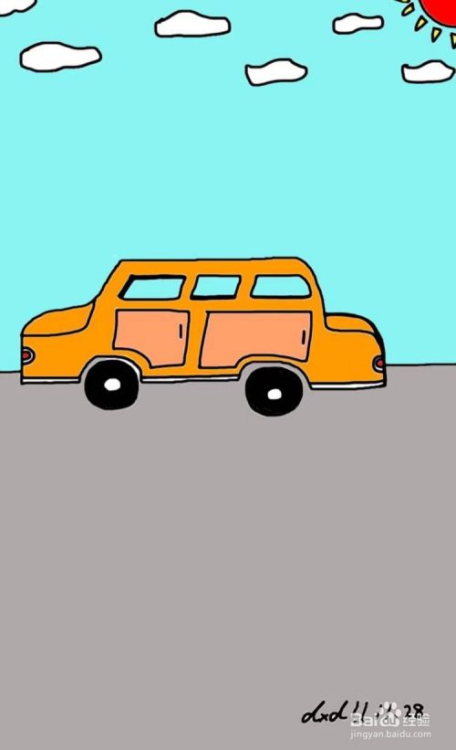 用笔画出太阳、白云和阳光。电容笔选择暗橘色画笔,使用油漆桶工具给车门上色。电容笔选择橘色画笔,使用油漆桶工具,给车身上色。红色画笔给太阳上色,黄色画笔给阳光上色。白色画笔给白云上色。