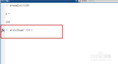 第一步在命令行窗口中输入“a=str2num('234')”,通过str2num函数将字符串转换成数字,如下图所示: