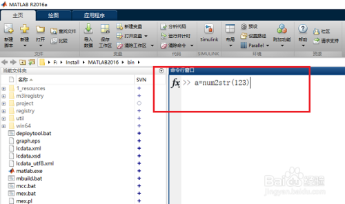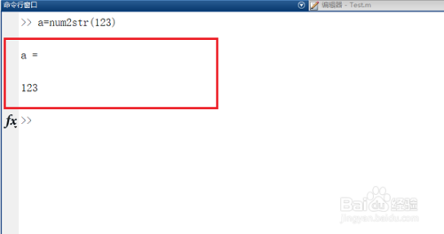 第一步在我们的电脑上打开matlab命令行窗口,输入“a=num2str(123)”,将数字123转换成字符串'123',如下图所示: