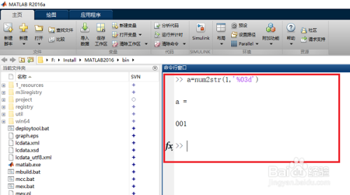 第三步有时候我们需要将数字转换成特定的字符串格式,如1到001,输入“a=num2str(1,'%03d')”,其中3是控制位数的,如下图所示:
