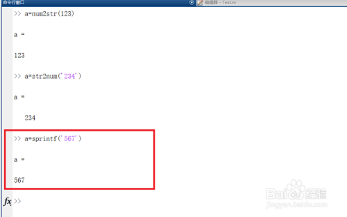 第三步我们也可以通过sprintf函数来将字符串转换成数字,输入“a=sprintf('567')”,按回车键得到数字567,如下图所示: