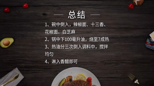 将烧热的油分三次泼洒,泼洒的过程中要不停的搅拌,最后淋上两滴香醋即可。