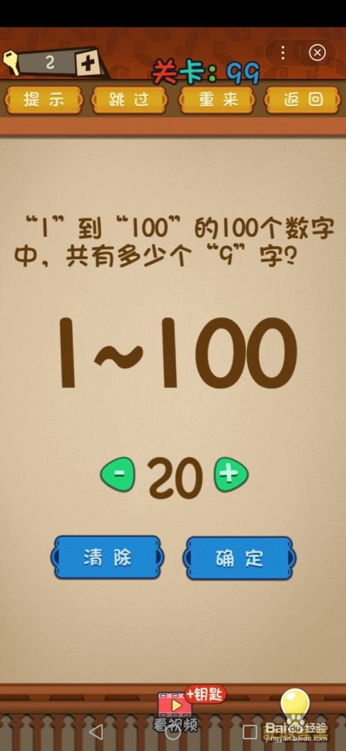 第99关答案是20个9,将数字调成20,然后点击确定就过关了。