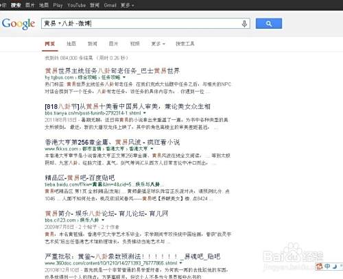 比如你要搜索一个关键词 黄易。那么第一个显示的就是黄易百度百科 而后出现的是黄易小说列表。但是你想找黄易的八卦。可是出来的都是黄易八卦的微博。怎么办?这里就用到了+ 和- 字符。