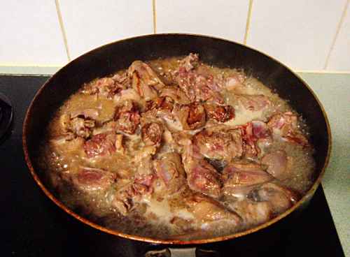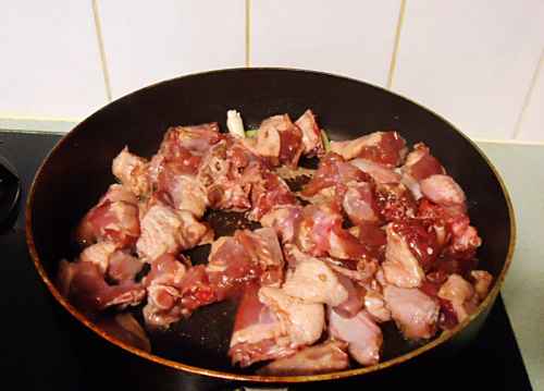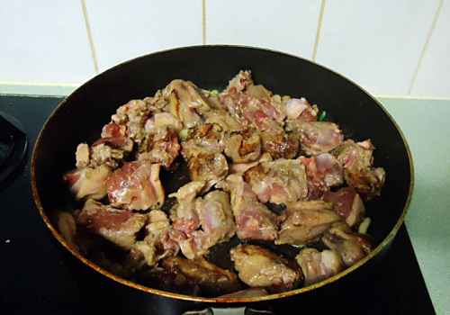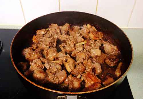 7调入适量生抽老抽料酒与少许白糖,注入适量开水,盖上锅盖大火转中火焖。