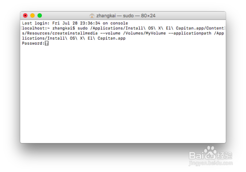 sudo /Applications/Install\ macOS\ Sierra.app/Contents/Resources/createinstallmedia --volume /Volumes/MyVolume --applicationpath /Applications/Install\ macOS\ Sierra.app如果您下载的为10.11 Capitan系统则输入: