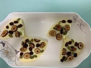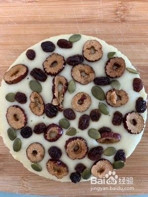 倒入搅拌均匀的山药面糊,撒上你喜欢的任意果干,然后用保鲜膜封起来,再戳几个洞
