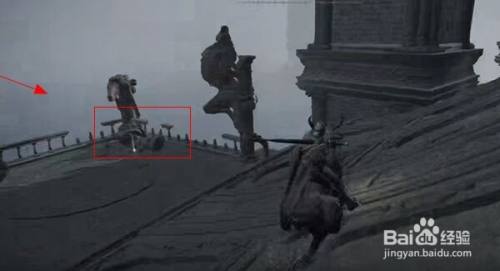 3、跳到下面后往右边跑,然后会看见一个平台,五指剑的位置就在下图箭头指向的地方;