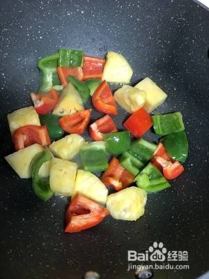 锅里放油,先炒双椒和凤梨,翻炒两三分钟后加点水,适量番茄沙司,适量生抽,一丢丢盐,两小烧白砂糖。等快收汁的时候把杏鲍菇倒进去翻炒两分钟,让汤汁均匀的挂在杏鲍菇上。