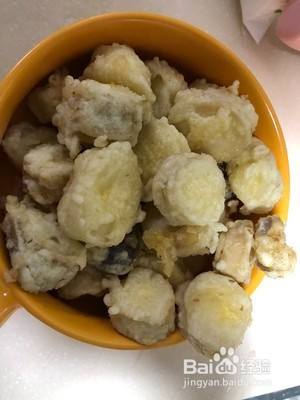 锅里放油,木筷子放下去冒泡泡以后把蘸了面煳的杏鲍菇放到锅里炸(炸的时候调中火)。表面金黄后捞出。再把油加热复炸一次(使表皮更酥脆)。