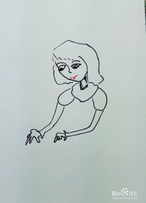 用线条和曲线画出这个小女孩儿的两个胳膊和手,并画出她身上穿着的短袖。