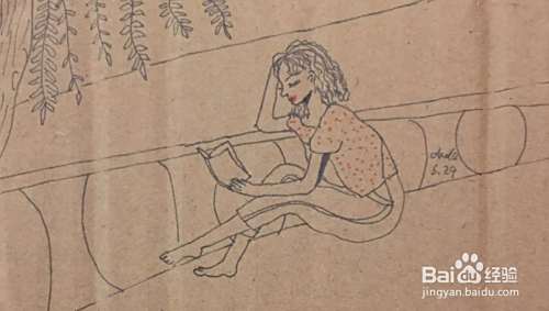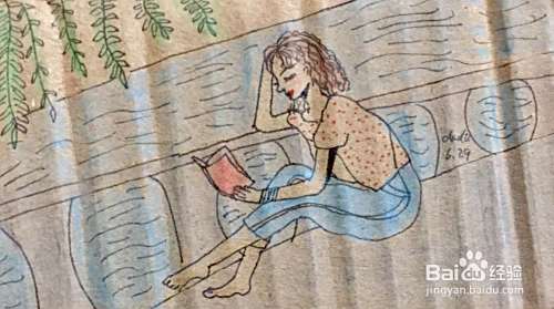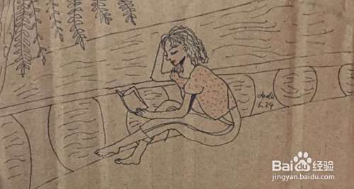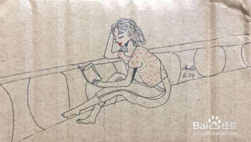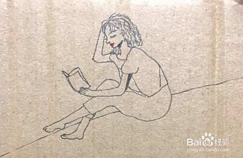 用笔画出丽莎的身体轮廓和服装。红色勾线笔画出丽莎上衣的装饰图案,在丽莎袖口下方线条下沿画出双臂。在丽莎的手上画出一本小书。