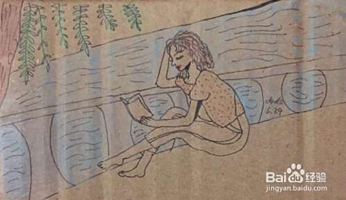 咖色彩铅画笔为丽莎的发型上色,用笔画出大桥和海水,蓝色彩铅画笔为海水和服装上色。灰色彩铅画笔为桥面上色,绿色彩铅画笔为树木的枝条上色。