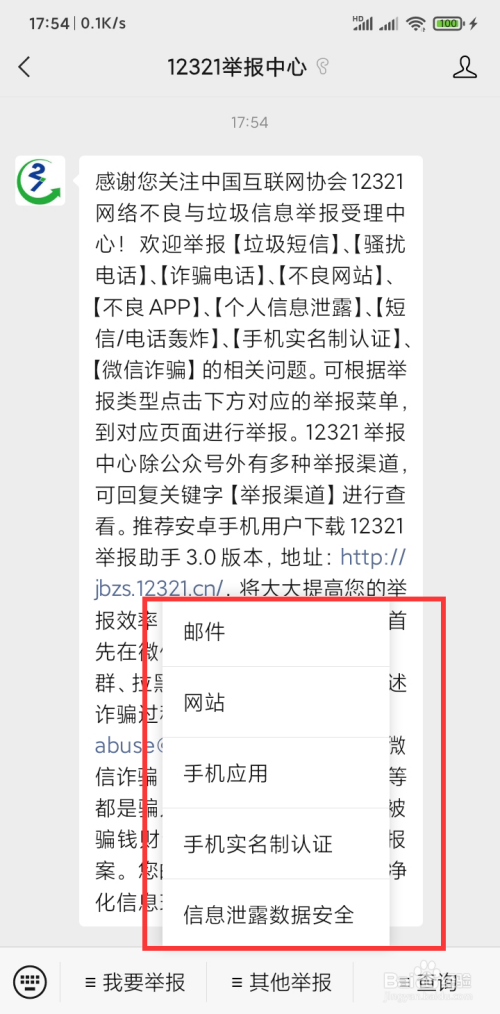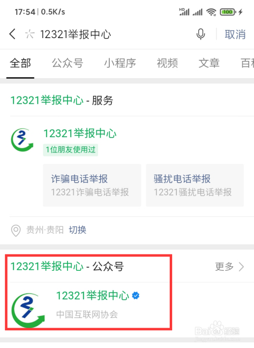打开微信,在搜索框输入12321举报中心,关注该公众号。