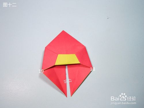 第13步、将图十二撑开,边16与角18对齐,边17与角19对齐,得到图十三。