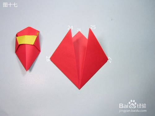 第17步、将图十六翻面,角24与角25沿着折痕翻折至顶角26。