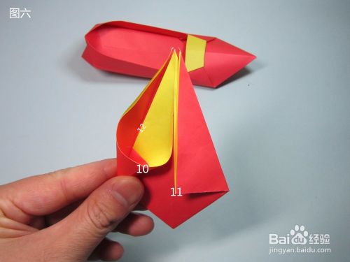 第7步、将图六中撑开的角10压折下去,折痕与内部的叠边12重合。