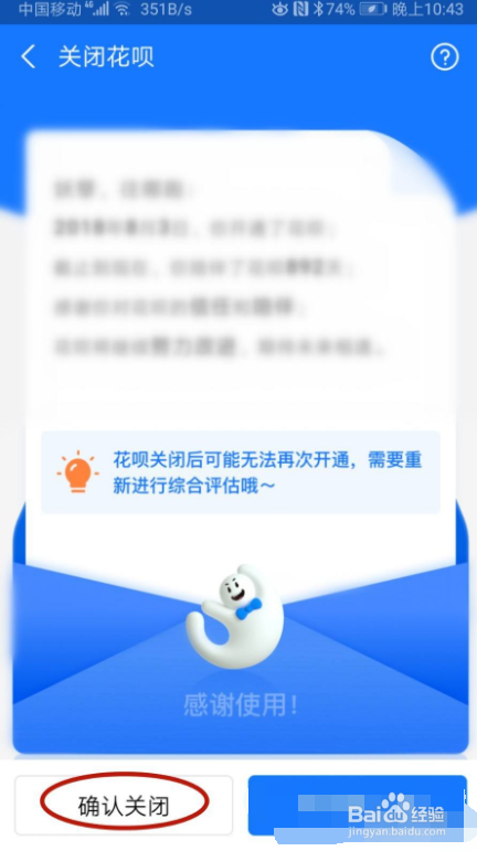 第五步,最后,打开关闭花呗的界面点击确认关闭选项。