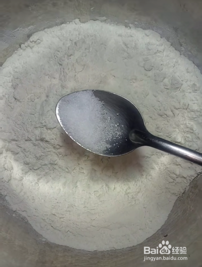 首先准备和面,盆中放入面粉,加入温水,放入少许食用盐,如下图所示。