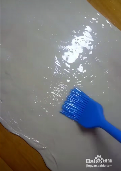 然后把小面团擀成饼状,刷上一层制作好的酥油,然后把面饼对折,用刀利成条状,用手措成长条状,盘成饼状,如下图所示。