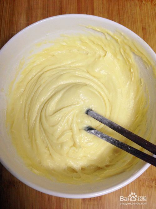低筋面粉和泡打粉混合好,加入搅拌好的混合液体中,并翻拌均匀。