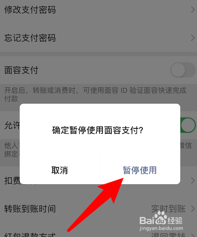 最后点击暂停使用面容支付即可,关闭之后删除微信账单就不需要人脸识别了。