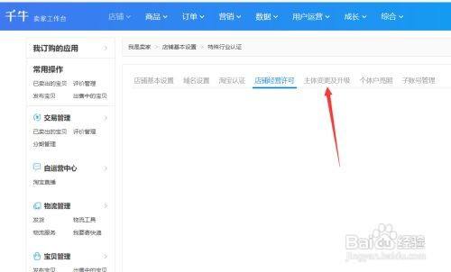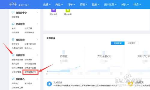 在淘宝首页登录卖家账户,并点击顶部进入【千牛卖家中心】,在千牛卖家中心工作台,找到左侧店铺管理下的【店铺经营许可】功能按钮进入。